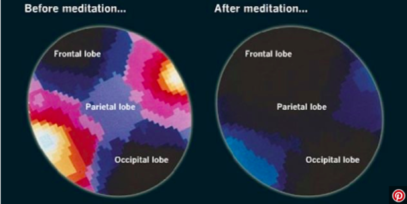 Şimdi biraz da bilimsel inceleme yapalım. İlk resimde meditasyon yapmadan önceki beyin dalgaları ile meditasyon yaptıktan sonra oluşan beyin dalgalarını görüyoruz.